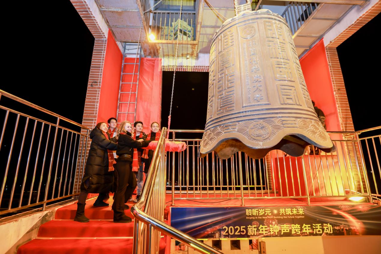 时间使者在雁栖湖校区标志性建筑钟楼顶部敲响新年钟声